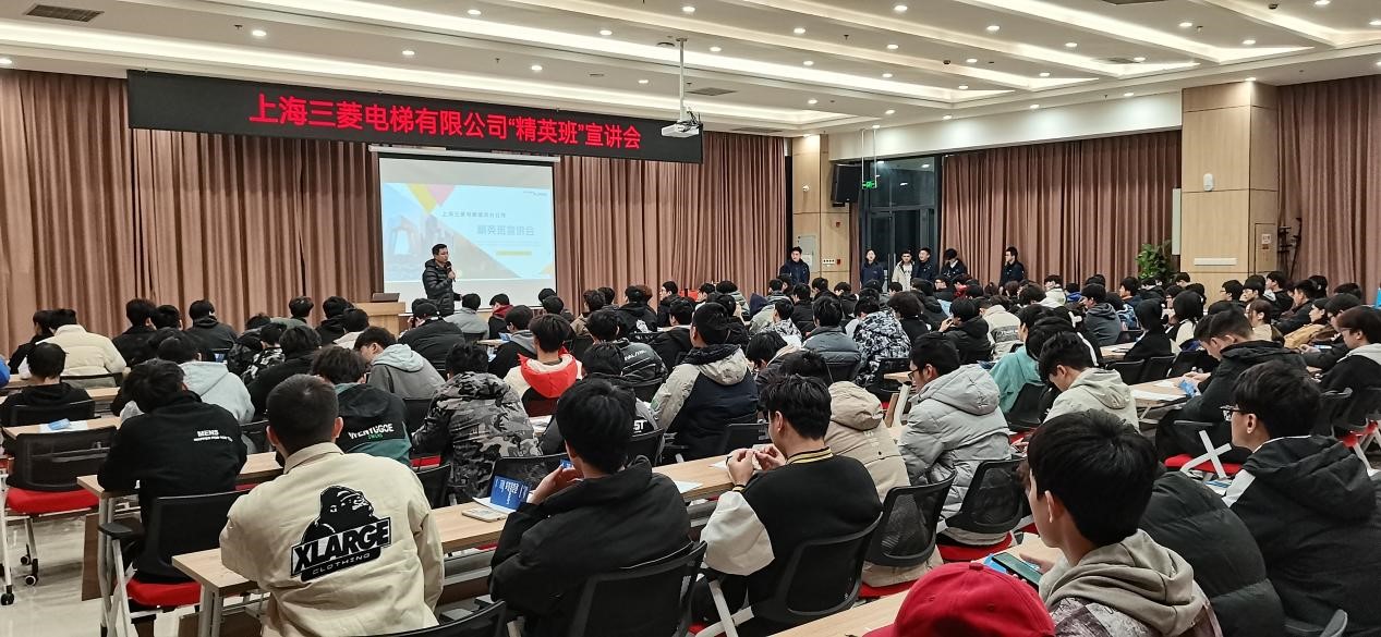 2024年1月14日,上海三菱电梯有限公司重庆公司教务处长高家军、人事部娄中镧经理一行到我校学术报告厅组织开展了上海三菱电梯有限公司“精英班”组建宣讲会,本次宣讲会面向我院22级机电一体化技术、电气自动化技术、工业机器人技术等相关专业200余名同学,择优录取组建上海三菱电梯有限公司“精英班”。