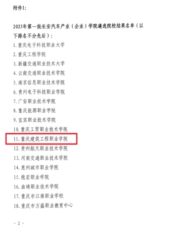2025年5月30日,重庆安驿汽车技术服务有限公司正式发布《关于公布2025年第一批长安汽车产业(企业)学院遴选结果的通知》。经过院校自主申报、企业严格评审,全国共20所职业院校脱颖而出,成功入选首批共建单位。我校凭借在智能网联汽车技术领域的扎实基础和产教融合的突出成果,荣列该名单之中。这标志着学院在深化校企合作、服务汽车产业转型升级方面取得了又一重要突破。