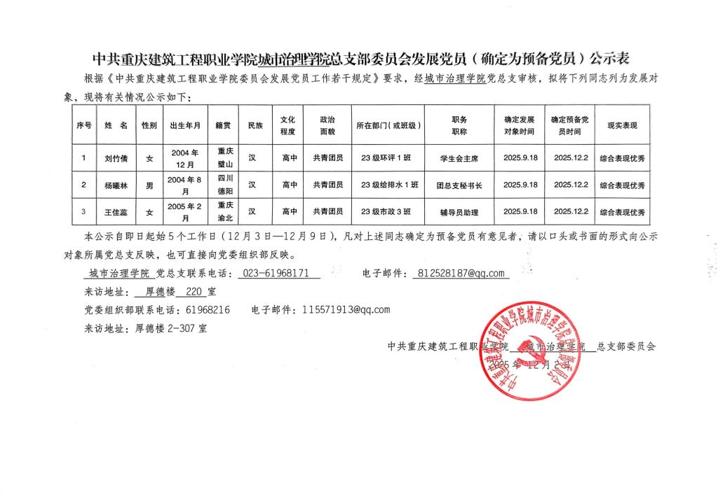 关于拟接收刘竹倩等三名同志为中共预备党员的公示