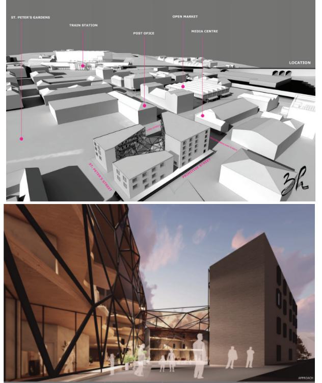 英国的Adrian Pitts教授对哈德斯菲尔德大学及所在的哈德斯菲尔德市做了概要的介绍,幽默的演说风格赢得在场师生热烈的掌声,并同高云教授一起,就哈德斯菲尔德大学与包括重庆交通大学在内的6所中国大学一起构建的“中国西南部可持续创新村落研究网”进行了简单的阐述,该研究网络致力于中国农村建筑的可持续性发展和文脉延续等问题。随后,哈德斯菲尔德大学John Bush 教授与其学生一起,就其指导的设计概念方案“ From Huddersfield to the Moon- and Back”做了详细的介绍,该项目方案为哈德斯菲尔德市中心一个闲置的汽车公园上新建一个唤醒公众认知的“栖息地”—酒店(A hotel)、旅馆(A hostel)、活动中心( A habitat)三个建筑功能组合而成的“3H建筑”,配合功能定位,建筑通过3个外观方正的建筑体量和内部空间形态的几何变化形成强烈对比,辅以行进路径上动态的玻璃幕墙切割形式,形成了一个融入当地气候、人文、以及环境的内生“宇宙空间”,方案丰富的视觉效果赢得了在场师生的赞誉。
