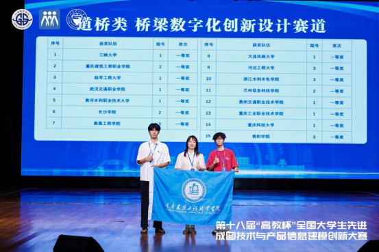 我校参赛选手凭借扎实的专业功底、精湛的技艺水平及卓越的创新能力,在大赛中脱颖而出。经过激烈角逐,参赛团队一举斩获 5 项国赛奖项,其中道桥类团体全国一等奖 2 项,建筑类、水利类团体全国二等奖各 1 项,机械类团体全国三等奖 1 项。这一成绩充分彰显了我校在工程图学及产品信息建模领域的雄厚实力。