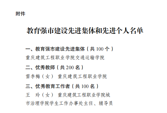 9月22日,重庆市人力资源和社会保障局、重庆市教育委员会联合下发《关于表彰教育强市建设先进集体和先进个人的决定》(渝人社〔2025〕443号),我校交通运输学院荣获“教育强市先进集体”荣誉称号,智能建造学院雷李梅老师荣获“优秀教师”荣誉称号,城市治理学院王玲老师荣获“优秀教育工作者”称号。