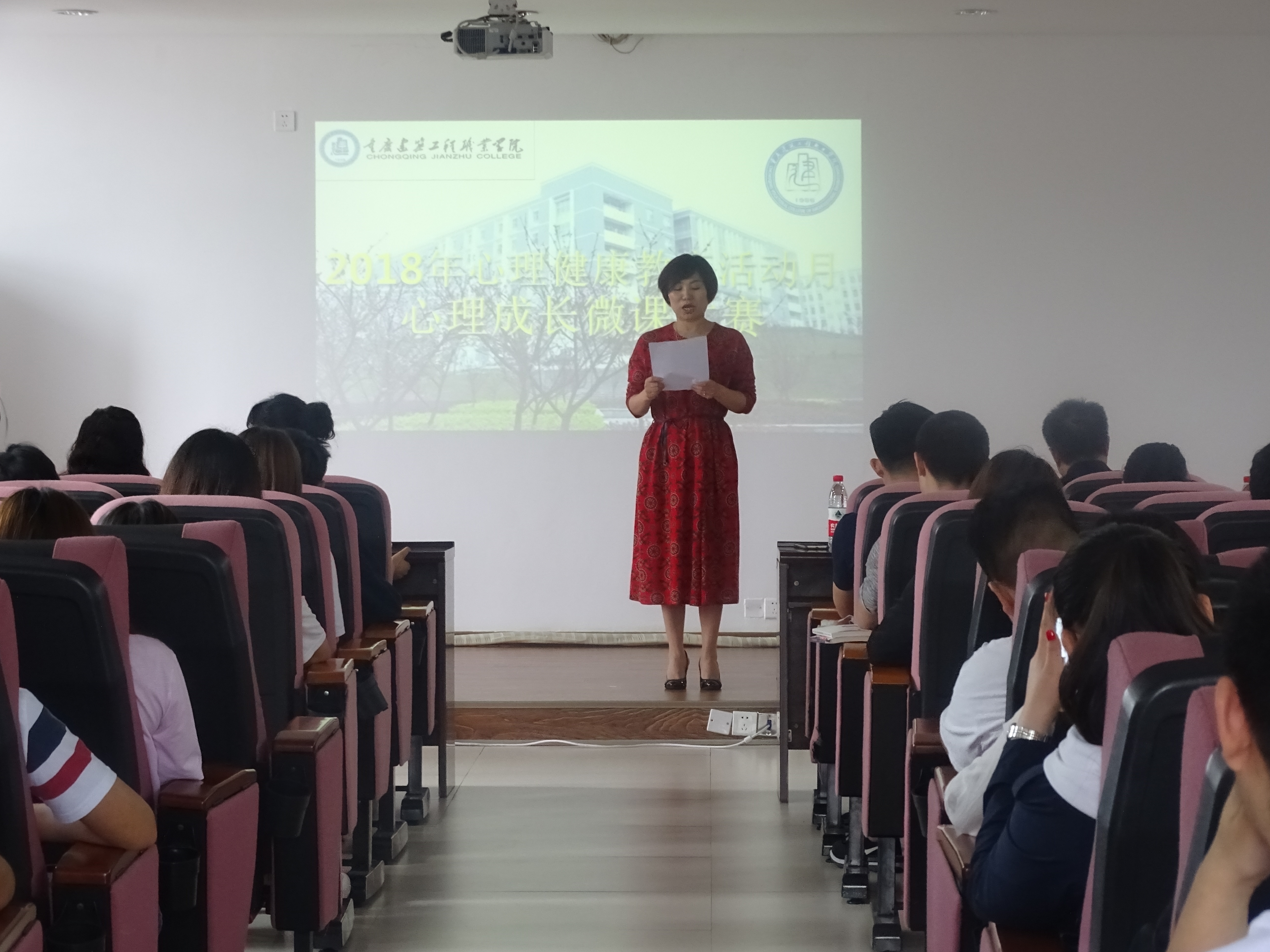 2018年5月11日12:30,由学工部主办的大学生心理成长微课大赛在2-411会议室举办。我院党委副书记龚群英、各系党总支书记、心理健康教师、全体辅导员、学生代表共计120余人参加了本次活动。