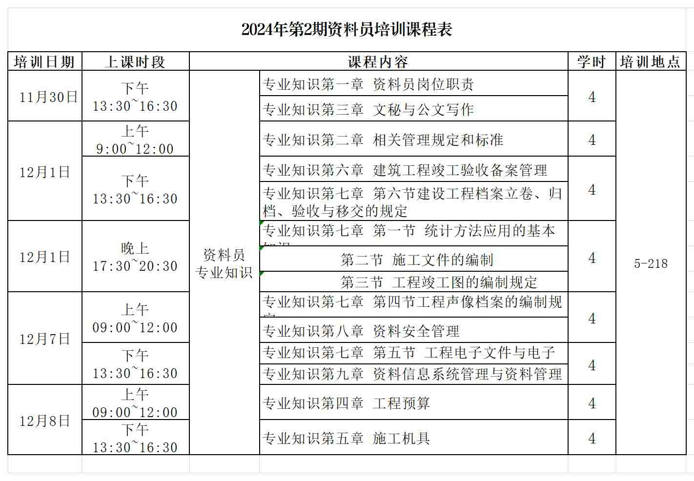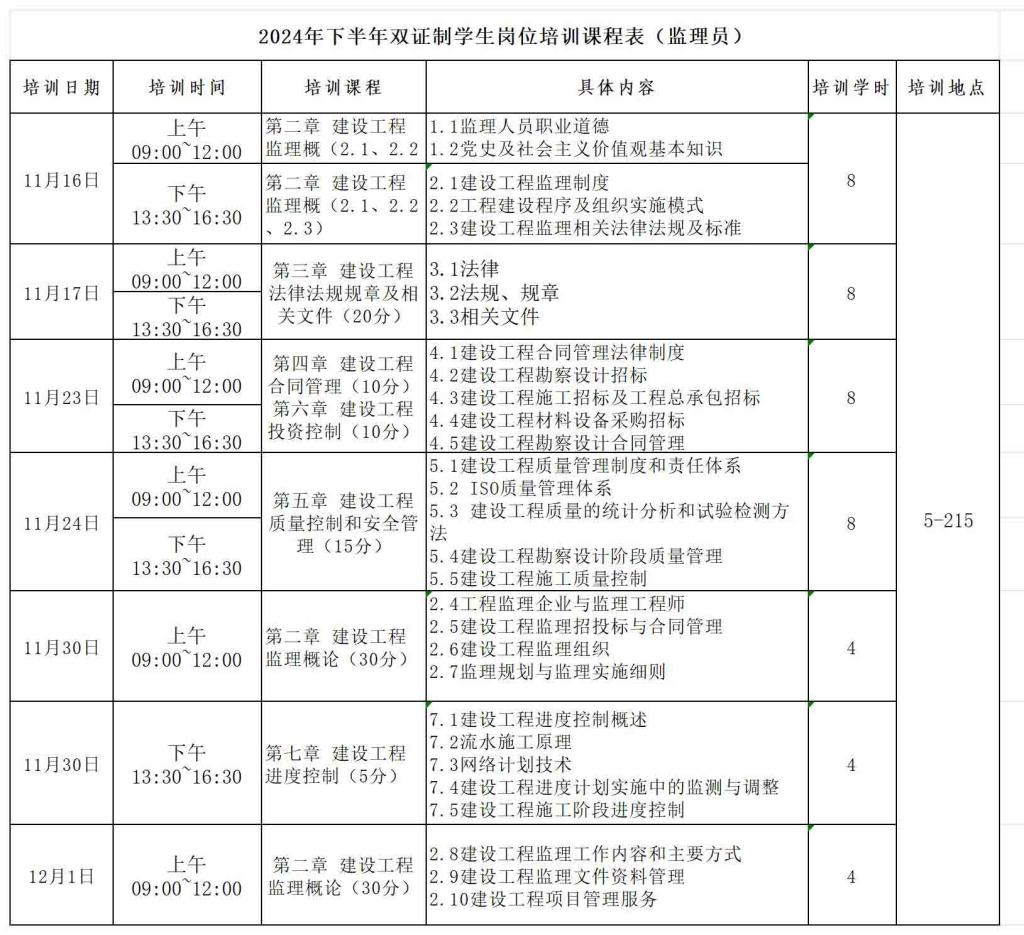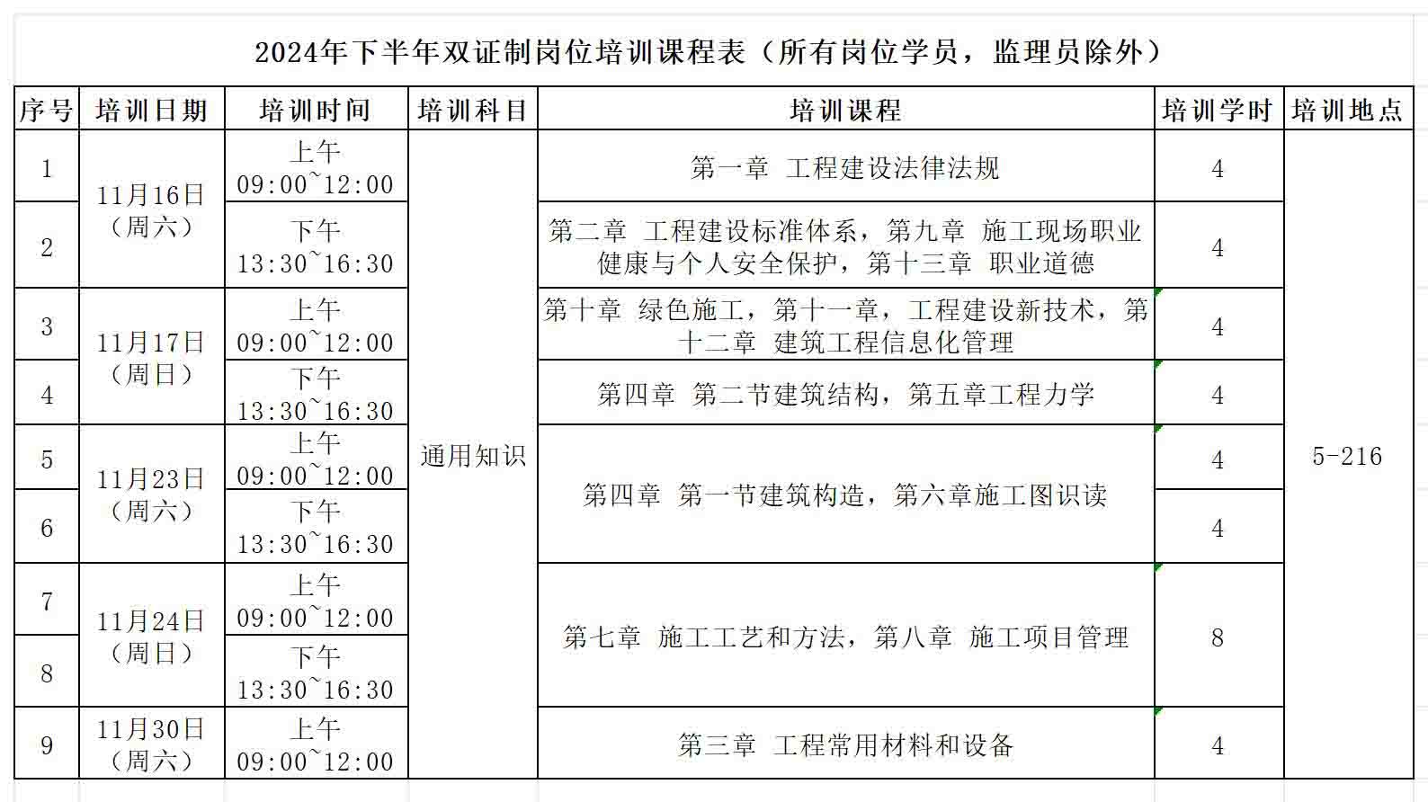 2024年11月16日-2024年12月8日,各岗位具体培训时间详见附件(培训课表)。
