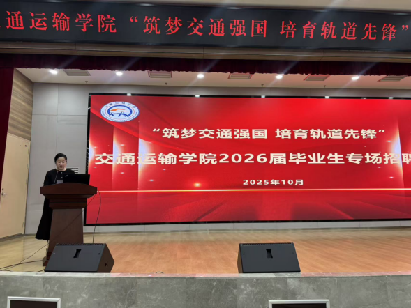 为深入贯彻落实国家“交通强国”战略部署,精准搭建毕业生与优质用人单位之间的桥梁,全力促进我院2026届毕业生实现更加充分、更高质量就业,10月22日,交通运输学院在广阳校区图书馆5楼报告厅,开展“筑梦交通强国 培育轨道先锋”2026届毕业生专场招聘会。这是我校首次由二级学院主办开展专场招聘会,活动分为集中宣讲与现场面试两大环节,交通运输学院党总支书记彭珂、学工办主任邓莉、全体毕业班辅导员和23级全体毕业生参加。