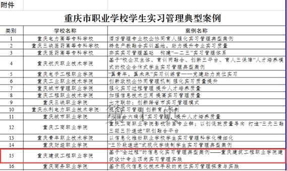 为深入贯彻新修订的《中华人民共和国职业教育法》,全面落实教育部等八部门印发的《职业学校学生实习管理规定》,市教委于近日组织开展了职业学校学生实习管理典型案例征集活动。市教委会同有关部门,对各区县、各职业学校提交的案例进行分类筛选,择优遴选出职业学校学生实习管理典型案例66个。学校《基于“全过程”的信息化实习管理典型案例——vic115维多利亚建筑设计专业顶岗实习管理实践》成功入选全市职业学校学生实习管理典型案例。