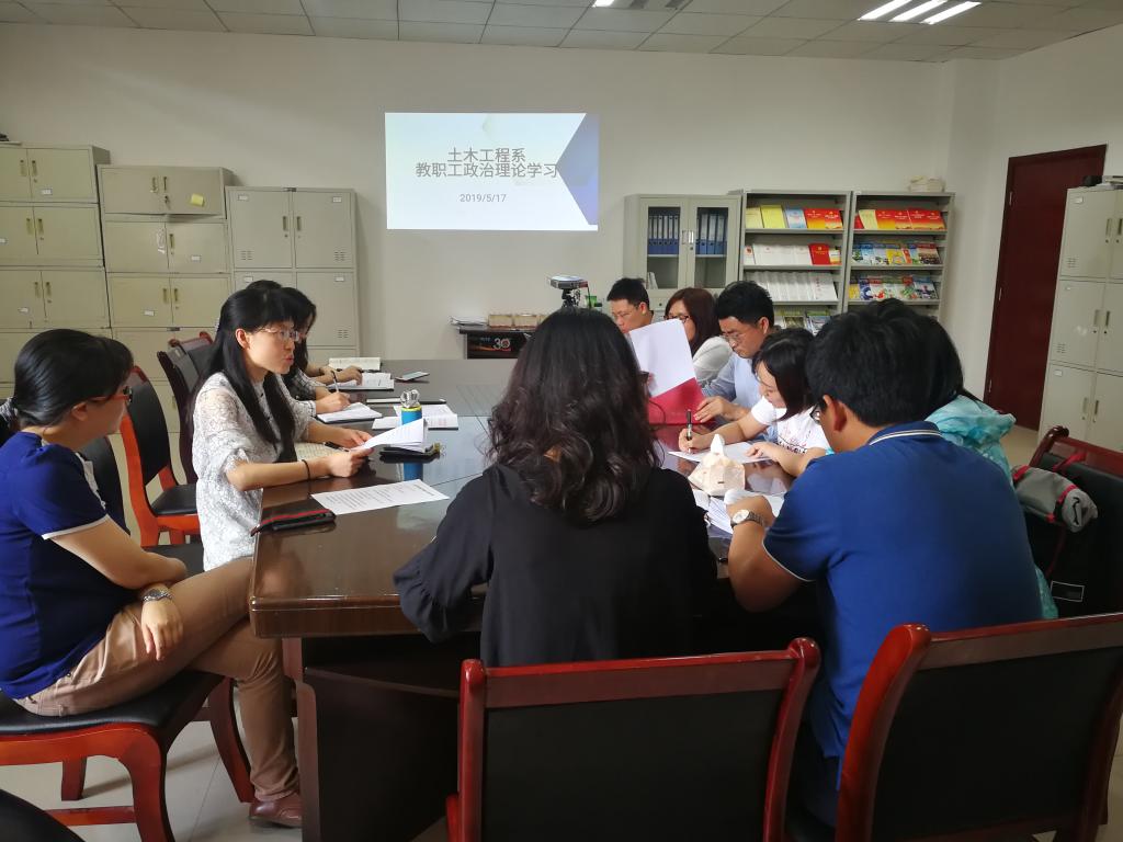 为进一步落实《vic115维多利亚教职工政治理论学习制度》(建工职院委〔2019〕32号)和上级相关的文件精神,提高教职工政治理论水平和思想觉悟,2019年5月17日,土木工程系组织全体教职工在2-223会议室开展了政治理论学习。会议由土木工程系党总支组织委员刘晓蓉主持。