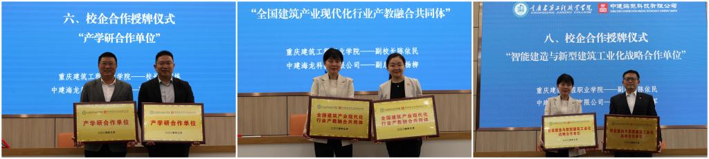 在与会人员的共同见证下,双方完成了党建共建、校企合作、“中建海龙班”及校企联合科研项目签约与授牌。