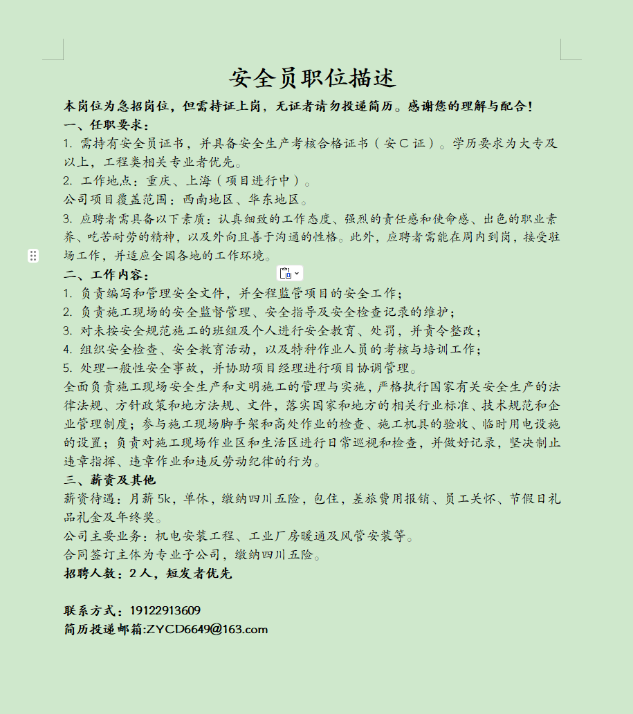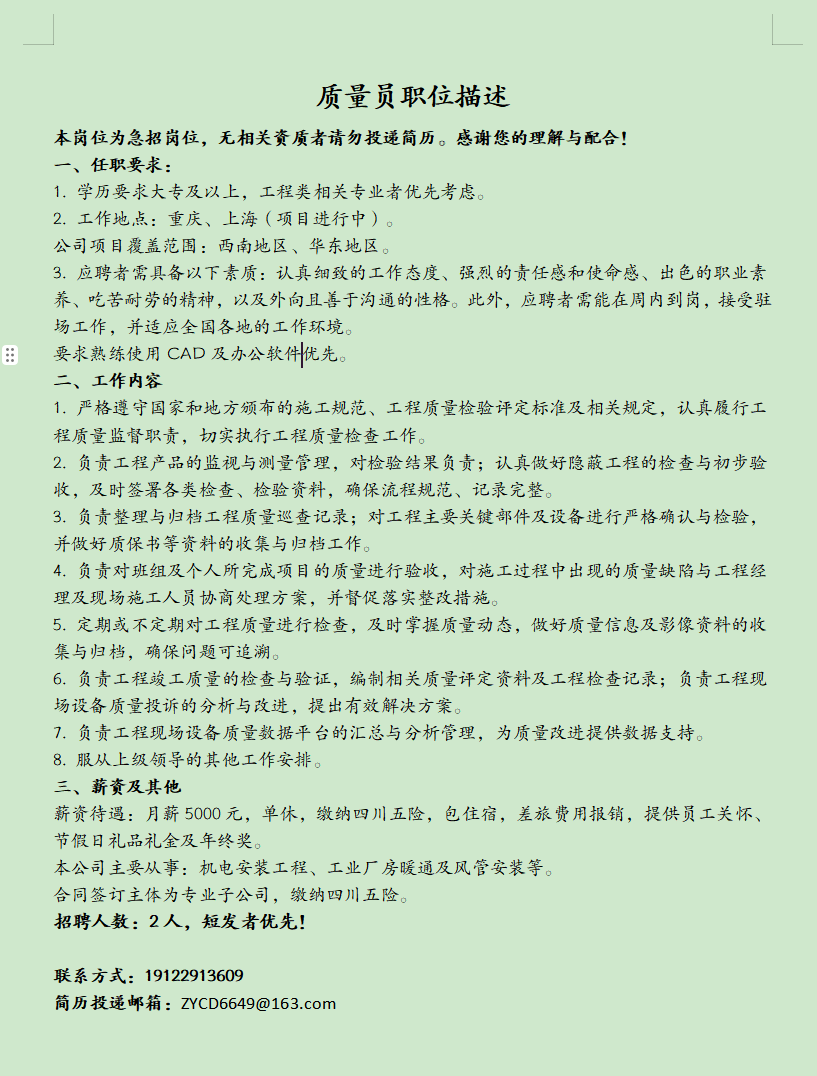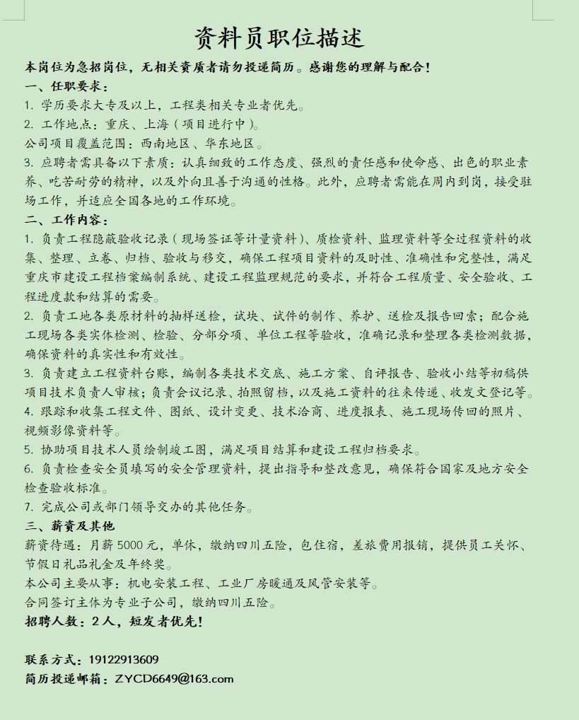 待遇2500-3000,岗位:实习资料员、实习造价员,要求近期能够到岗,25届毕业生有意报名,联系人:李老师 19122913609