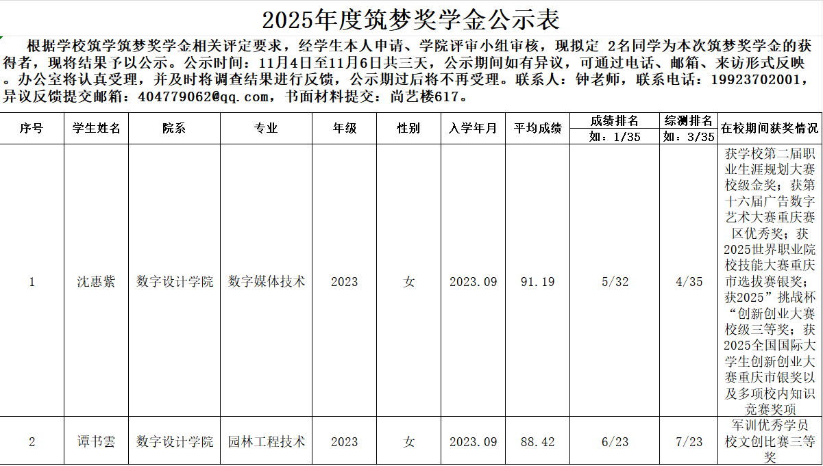 数字设计学院2025年度筑梦奖学金公示