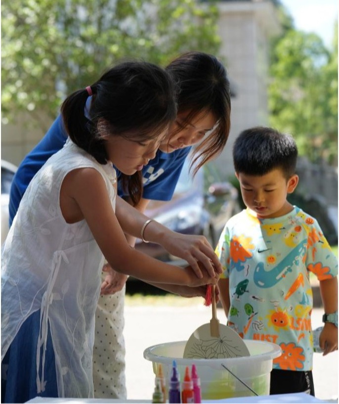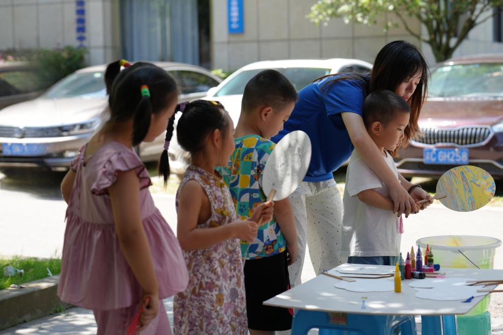 随后,孩子们井然有序地排队围站在水桶前,“我要给妈妈弄一个漂亮的扇子”开始了小朋友们的漆扇制作之旅。桌上摆放着素白扇面、天然颜料,孩子们像小画家一样,自由搭配自己的颜料。尽管颜料不慎沾到手尖,但孩子们毫不在意,他们全神贯注地让自己的创意在扇面上绽放。