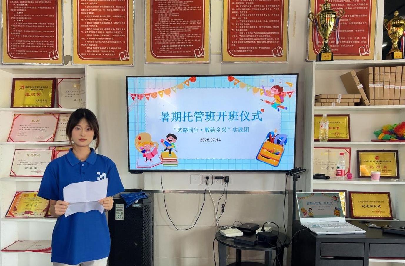 2025年7月14日清晨,稚嫩的童声打破重庆市江津区四面山镇政府文化活动室的宁静,“七彩假期·爱心托管”暑期课堂开班仪式举行,拉开了“艺路同行·数绘乡兴”实践团“七彩假期·爱心托管”暑期课堂的序幕。