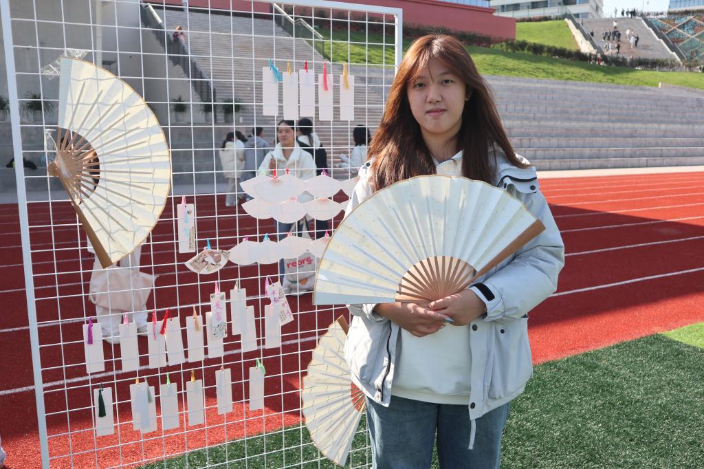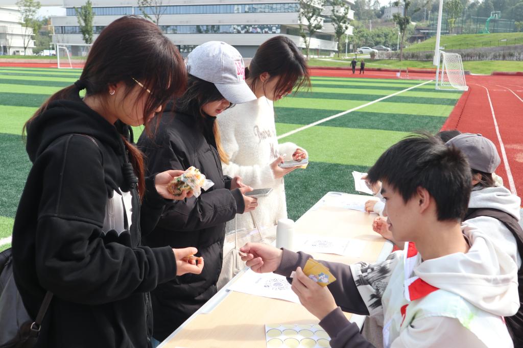 游戏互动区更是热闹非凡,四大关卡同步开放,让师生在趣味体验中深化对太极文化的理解。在太极知识快问快答环节,同学们思维敏捷,巧思答辩;太极手势打卡区里,同学们模仿“抱球式”“按掌式”定格美好瞬间;太极“推手”平衡赛中,选手们巧用巧劲展现“以柔克刚”的智慧;太极文化书签制作环节,师生们亲手设计太极书签,将“阴中有阳、阳中有阴”的文化内涵融入创作,成品兼具观赏性与纪念意义。集齐印章的师生兑换到太极图案钥匙扣、手绘扇面、太极盲盒等特色礼品,脸上洋溢着收获的喜悦。