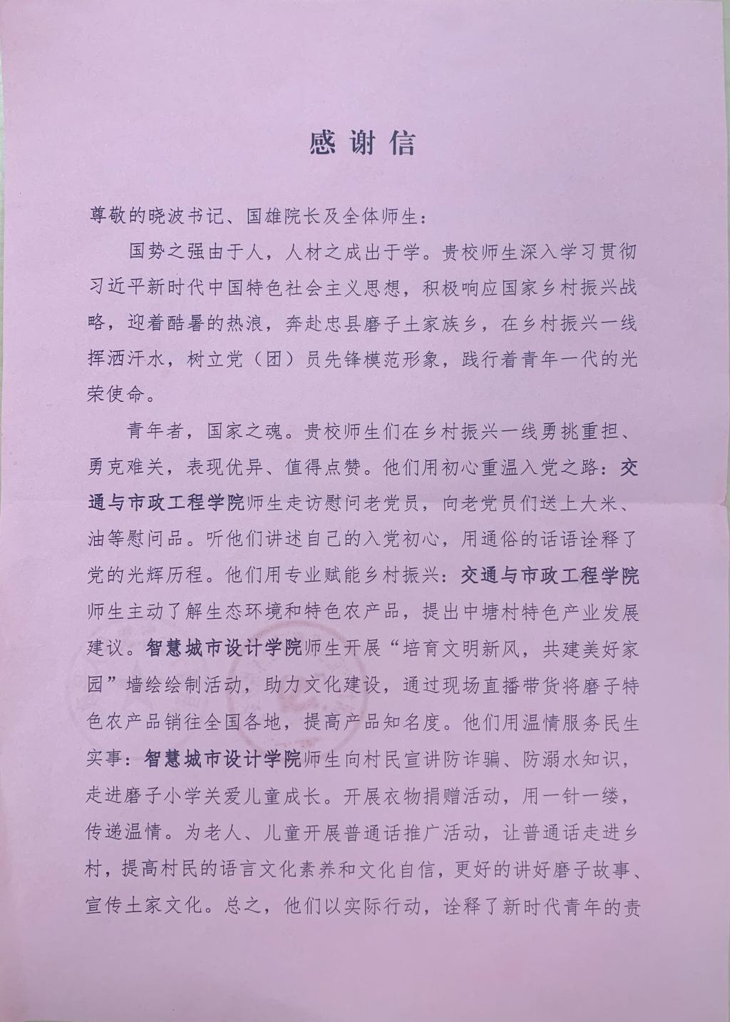 近日,中共忠县磨子土家族乡委员会、忠县磨子土家族乡人民政府向我校发来感谢信,致函感谢交通与市政工程学院、智慧城市设计学院师生组成的“三下乡”实践团队深入忠县磨子土家族乡开展暑期社会实践调研工作。信中还对我校2支大学生暑期社会实践团队在赋能乡村振兴、服务地方经济发展方面所做出的积极贡献表示衷心感谢。