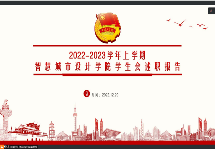 为了更好地推动学生会工作发展,进一步发挥学生骨干的模范带头作用。2022年12月29日,智慧城市设计学院2022-2023学年学生会第一学期工作述职评议大会采用腾讯会议在线上顺利召开。出席本次会议的有设计学院团总支书记张樱稆,以及全体学生会成员。