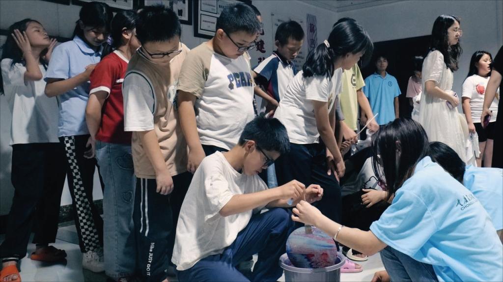 以漆为笔,以水为墨,非遗漆扇制作是一次文化传承与创新的碰撞。实践团成员们为小朋友们简单介绍了漆扇的制作过程,并进行了漆扇制作示范。小朋友们跃跃欲试,在精美的扇面上书写“忠义”,并精心挑选自己喜欢的原料,亲手将扇子放入水中,扇面逐渐被色彩覆盖,一面面与忠义文化紧密联系且充满创意的漆扇逐渐成型。这不仅是一次将忠义文化内涵与非遗工艺巧妙融合的创新实践,更是将忠义之魂深深植入孩子们心中的宝贵契机。