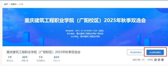 点击对应校区双选会点击展位预定,并登陆企业账号(未注册企业请先注册)