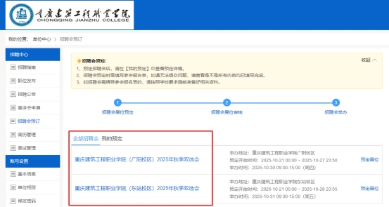 点击双选会预定,选择适合企业招聘的专业相应的校区点击“预定展位”,并按要求填写招聘岗位(具体专业可查看附件:2026届毕业生信息表)、单位联系人等信息。